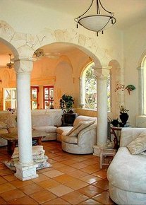 Если купили дачу на «югах», оформить ее можно в средиземноморском стиле. Уникальный морской климат этих мест диктовал свои правила в создании интерьеров. Так, в качестве стеновой отделки использовалась в подавляющем большинстве случаев фактурная штукатурка (лучше всего на основе мраморной крошки и гипса), а напольного покрытия – керамическая плитка.