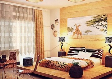 Стилевая принадлежность подчёркивается африканским декором (вазы, статуэтки богов), используемыми в дизайне шкурами животных и плетёной мебелью из рогатина.