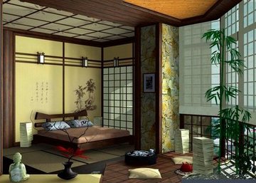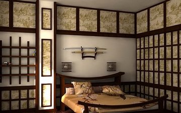 Что до декора, то его здесь попросту нет, по крайней мере, в привычном нам понимании этого слова, если не считать за таковой раздвижные решетчатые ширмы – непременный атрибут этого стиля. Чтобы ещё более подчеркнуть японский мотив можно украсить комнату бросаем или веточками сакуры.